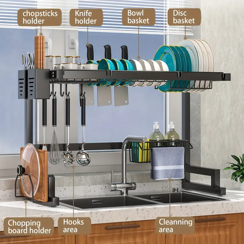 Suport multifunctional pentru uscarea vaselor, poate organiza toate ustensilele, furculitele, farfuriile, buretii de spalat vase, capace, fructe, legume. Toate articolele din bucatarie intr-un singur loc. (Nu contine suportul pentru cutite)